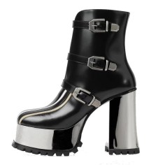 Round Toe Chunky Heels Platforms Robotic Black Silver Metallic Ankle Buckle Straps Boots - BlackShaft Material: Genuine Leather