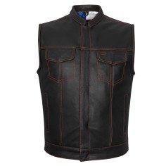 HMM924R High Mileage Men's Zipper and Snap Closure Leather Club Vest with American Flag Liner and Red StitchingThis fine soft lined black leather vest is made from soft, thick, and durable pr...