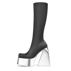 Round Toe Low Chunky Heels Over The Knee Stretch Side Zipper Boots - Silver Faux Leather