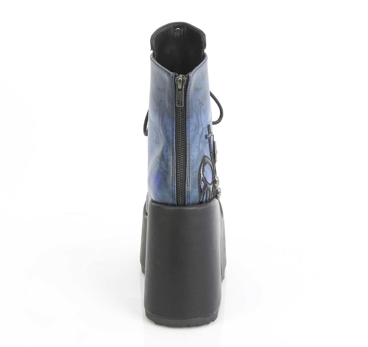 5 inch Chunkyheel, 3 inch Platform Lace Up Ankle Boot, Metal Back Zip 5 inch (127mm) Chunky Heel, 3 inch (75mm) Platform D Ring Lace Up Dront Ankle Boot Featuring Moonlit Cathedrial Printed Artwork & Charm Detail, Metal Back Zip Closure