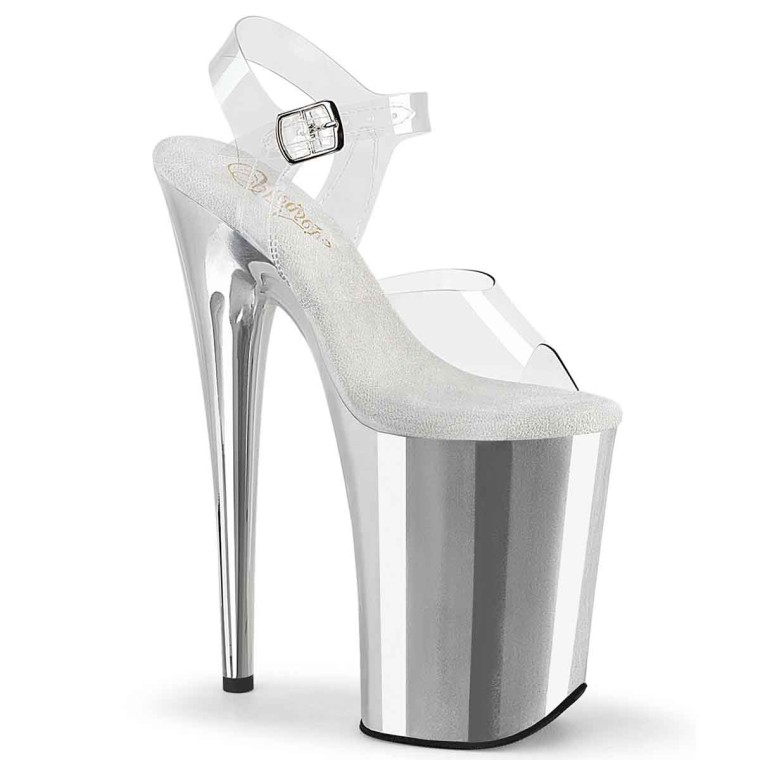 Pleaser Infinity-908 - Clear Silver Chrome in Sexy Heels and Platforms is made for Women and comes in Clear, Silver and is made of Chrome material. It is marked as AnkleStraps, Platforms, Sandals. The size is Womens 10 and weighs 4.4 lbs.