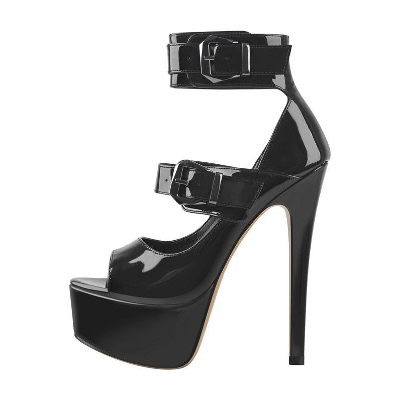 Maken Peep Toe Stiletto Heels Ankle Buckle Straps Platforms Sandals - Black in Sexy Heels and Platforms is made for Women and comes in Black and is made of Patent material. It is marked as Stilettos, Sandals, Platforms. Sizes are from Womens 5 to 15 and weighs 1 lb.