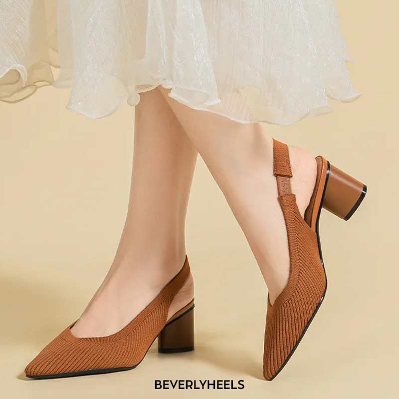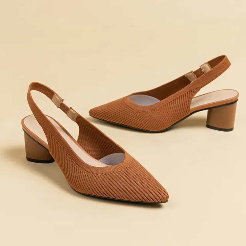 Emma Jones Pointed Toe Chunky Heels Cotton Fabric Summer Slingback Sandals - Auburn in Sexy Heels and Platforms is made for Women and comes in Brown and is made of Cotton Fabric material. It is marked as Sandals, Chunkyheels. Sizes are from Womens 3 to 11 and weighs 1 lb.