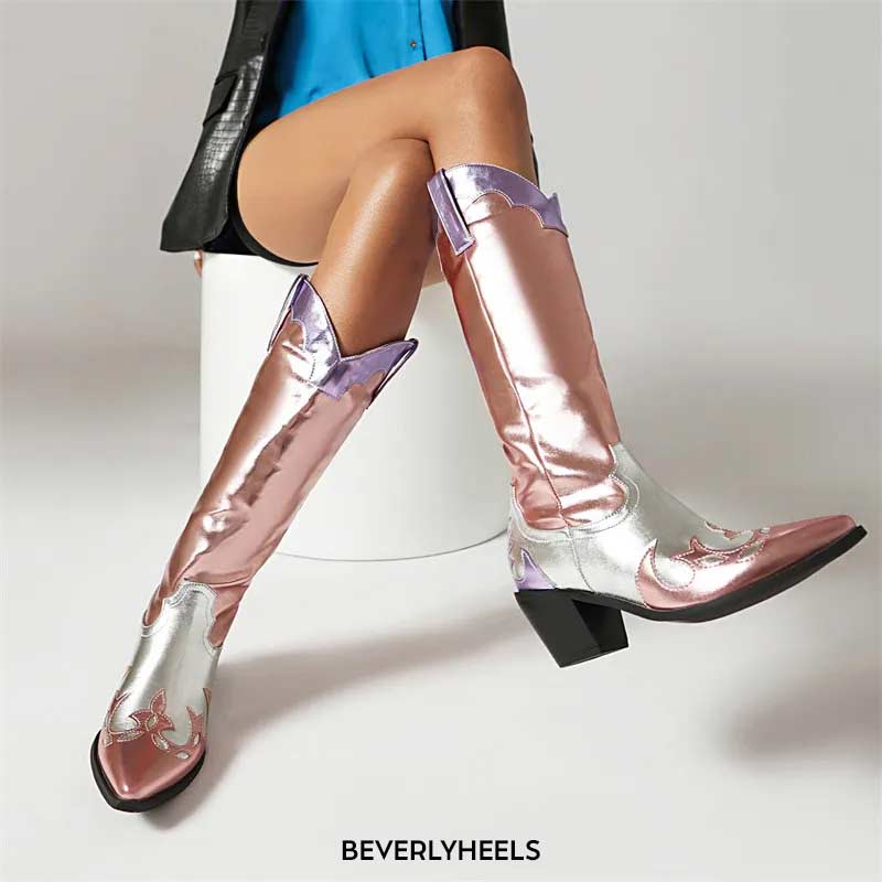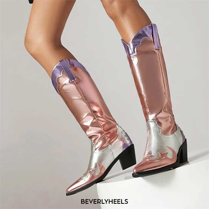 Pointed Toe Chunky Heels Knee High Western Cowboy Boots - Silver by Lib