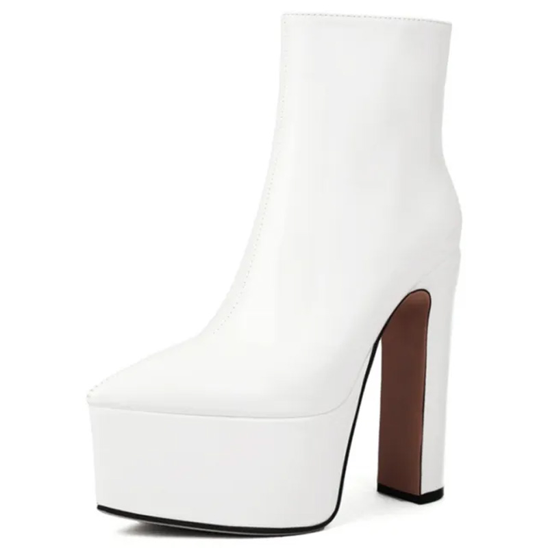 Lib Pointed Toe Platforms Side Zipper Chunky Heels Ankle Highs Boots - White in Sexy Boots is made for Women and comes in White and is made of Faux Leather material. It is marked as ChunkyHeels, Boots, Platforms, AnkleHighs. Sizes are from Womens 4 to 11 and weighs 1 lb.