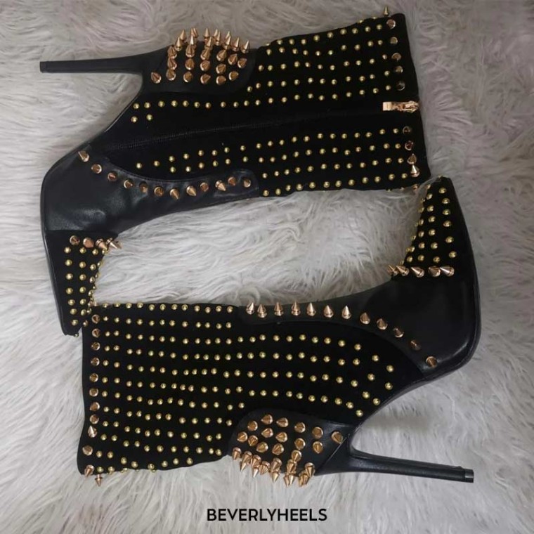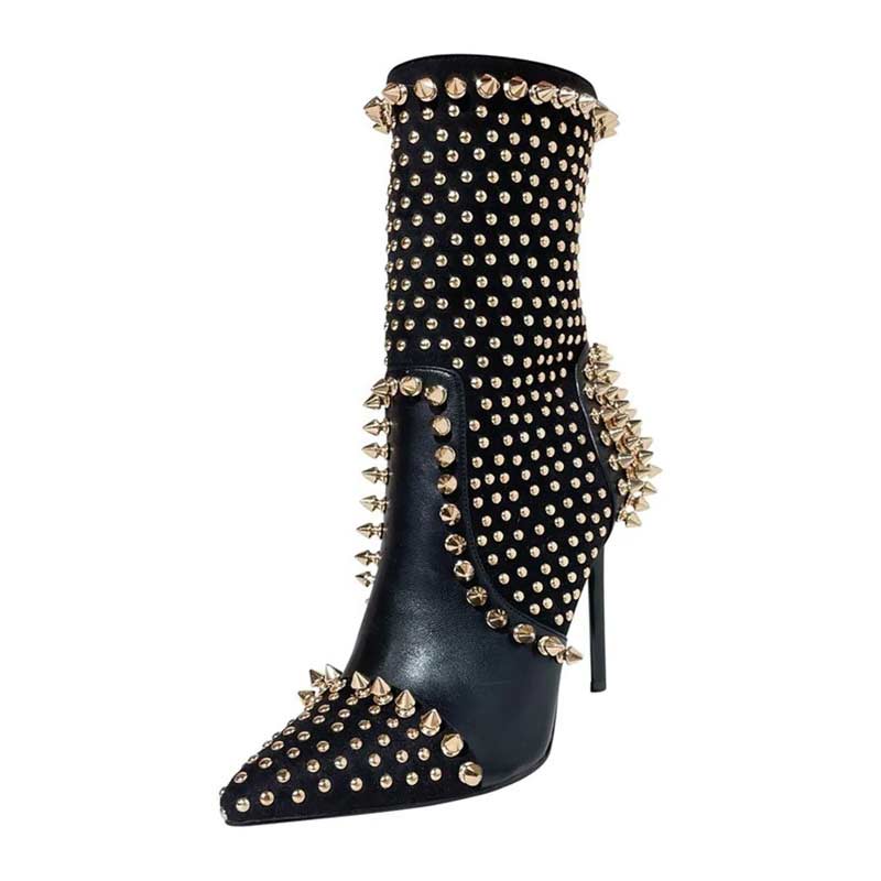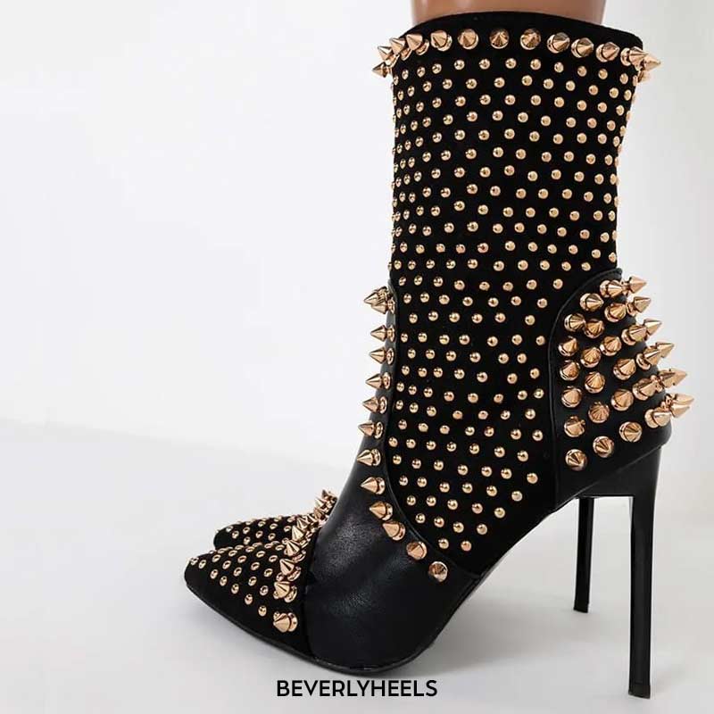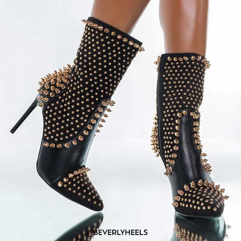 Lib Pointed Toe Stiletto Heels Side Zipper Rivet Decorated Punk Gothic Ankle Highs Boots - Black in Sexy Boots is made for Women and comes in Black and is made of Faux Leather material. It is marked as Boots, Stilettos, AnkleHighs. Sizes are from Womens 5 to 10.5 and weighs 1 lb.