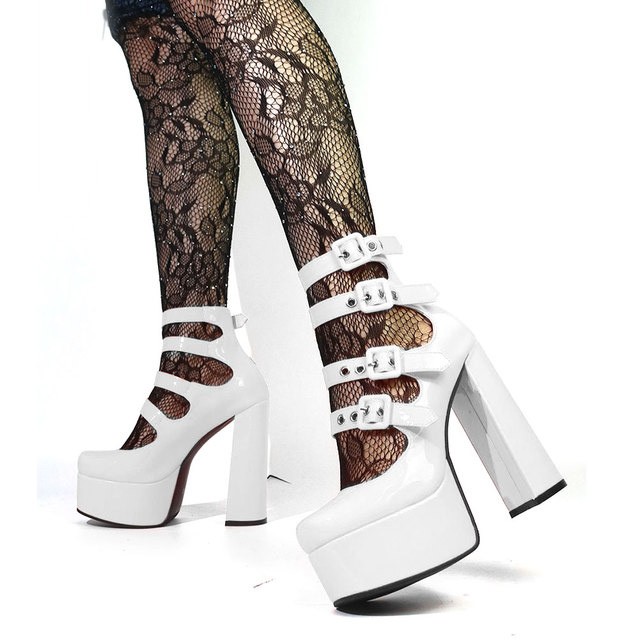 Emma Jones Round Toe Chunky Heels Platforms Ankle Buckle Straps Punk Rock Gothic Pumps - White in Sexy Heels and Platforms is made for Women and comes in White and is made of Patent material. It is marked as Platforms, Pumps, ChunkyHeels,. Sizes are from Womens 5 to 9.5 and weighs 1 lb.